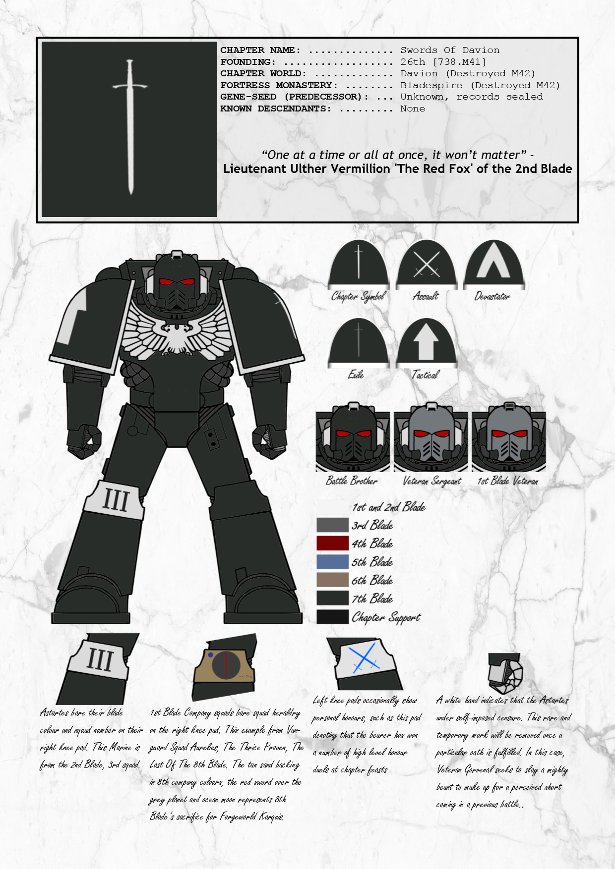 I've also expanded the narrative of the force, coming up with how the chapter dealt with primaris marines, the return of Bobby G and how evolved their tactics post great rift. The concept of Davion Primus falling to chaos early generated some really cool ideas for a narrative campaigns as it gives the Swords an immensely important goal to chase. I also expanded the concept of Davion to include an entire sector known as the Imperial Davonic Republics, which will be the playground of the events I run next year.