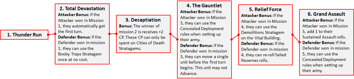 If you were looking for some suggestions on running the Cities of Death missions as a linear narrative campaign however, we've got you covered. We recommend the following structure and bonuses, to represent a series of battles taking place across an urban battlescape connected to each other as part of a larger narrative. We generally recommend picking an Attacker and Defender at the start of the campaign and sticking to that throughout the course of the campaign.