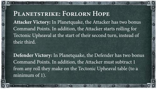 has to be taken in the Attacker/Defender armies, plus a set of custom Attacker/Defender Warlord Traits and a set of Attacker/Defender stratagems that only work in the Planetstrike missions. The linear campaign for Planetstrike sees players running through all six missions with bonuses to the winning player of each game.