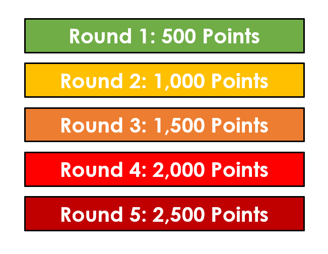 - How should points increase with each round? You want your points to increase enough to have each round feel like a significant increase, but not so much that players struggle to model and paint that amount to add to their armies. Increments of 250 or 500 points work best for this.