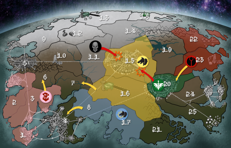 Both campaigns are fairly standard map campaigns, and they function similarly to how you'd expect a map campaign to run - each round players determine an attacker and a defender, then the attackers declare the territories that will be the target of their attacks, and more than one attacker can choose the same territory. Defenders then choose territories to defend or neutral territories to claim, and more than one defender can choose the same territory. Then players play a battle for each territory containing attackers and defenders, and the winners get control of the territories they were fighting over. Undefended territories are automatically claimed. In order to incentivize defense and spread out attacks, players attacking undefended territories can choose to Raze them, reducing their value.