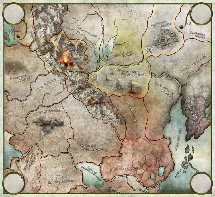 Firestorm's campaign map. Players put removable stickers on this to mark their positions and held regions. Credit: Warhammer-Community