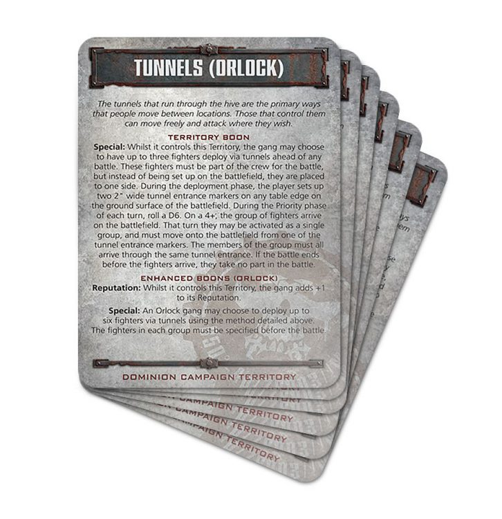 In a Dominion campaign, players use the Dominion Territories deck, a deck of cards where each card represents a specific territory for gangs to fight over and claim in their quest to dominate the underhive and expand their turf. At the start of the campaign, the Arbitrator generates a number of territories based on the number of players in the campaign and reveals a number. Then players challenge each other to fight battles over the revealed territories, with each game having one territory at stake that goes to the game's winner. After all the revealed territories have been claimed, the Occupation Phase ends and the Downtime Phase begins, during which gangers recover, captives are returned, juves are promoted, and new gangers are recruited. Once that ends, the Takeover phase begins, in which players challenge opponents for territories they wish to seize and fight battles over held territories.