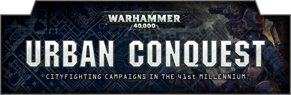 Urban Conquest. Rather than focus on a broad map spanning a whole planet, Urban Conquest has players fighting over a single massive city, attempting to conquer it block by block. In addition to a city map, the box also included a series of Location Cards to build the campaign map with, a set of Strategic Resource Cards to play during games, some Random Event cards, and a set of three Strategic Goal cards that give players additional goals during the campaign. Urban Conquest leans heavily on the Cities of Death rules for Warhammer 40k 8th edition, which add more detailed rules for fighting in urban environments. Unlike the fixed map of Firestorm, Urban Conquest uses location cards to randomly generate maps each campaign, creating a more procedural element.