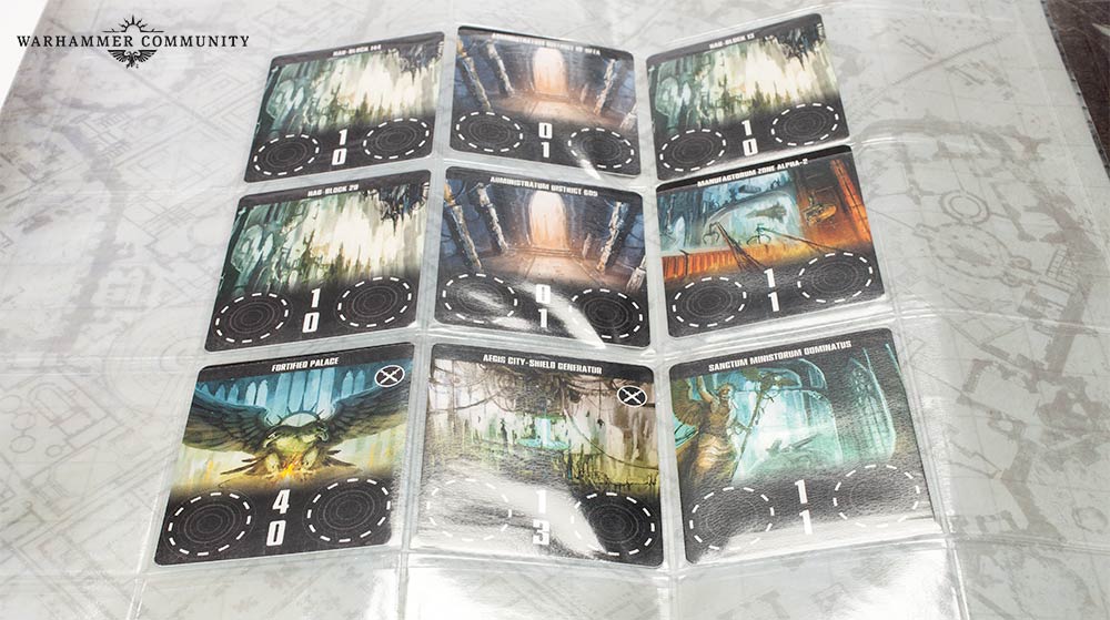 Players start by picking an Army Faction they'll build their lists from, then they generate a cityscape by shuffling the Location deck, and then placing those in each slot on the campaign map (the box comes with a clear plastic card holder for these). The Locations deck has a series of regular locations plus six Special Locations like the Prometheum Reactor and Orbital Shuttleport that require special resources to assault and necessitate playing a special mission based around that location (these have a predetermined terrain setup). Once locations are set, players generate a Starting Random Event from the Random Events deck, a Strategic Goal, and pick their starting territories. There are multiple layouts players can start with, depending on the number of players they have, and each one dictates a different Strategic Goal.
