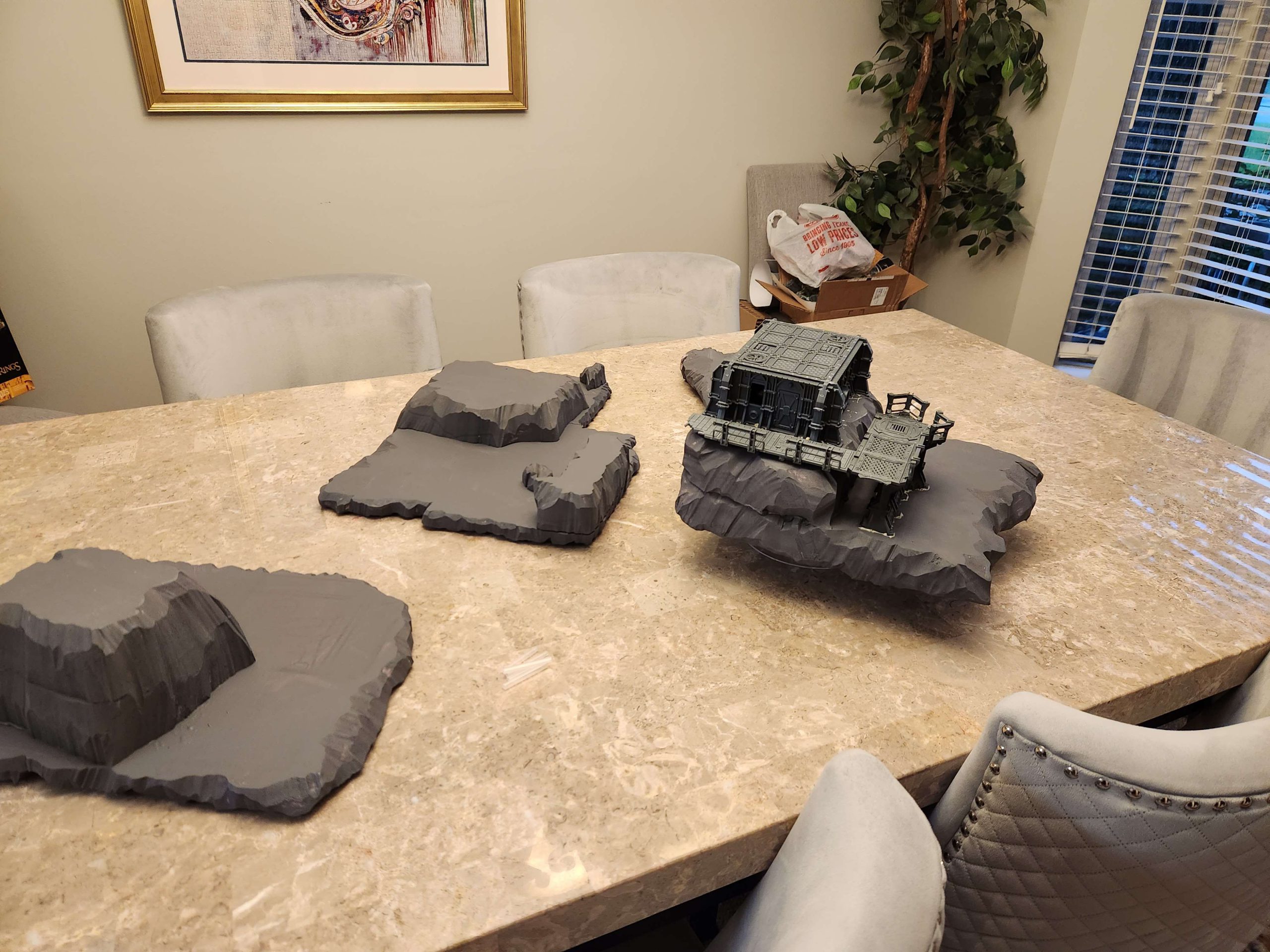 On top of this I found some solid "piles of rock" 3d-printed terrain on Amazon I can add to these to help add to the visual effect of a mining facility, and a 3d-printed landing pad I have will work for sprucing up one of the other asteroids.