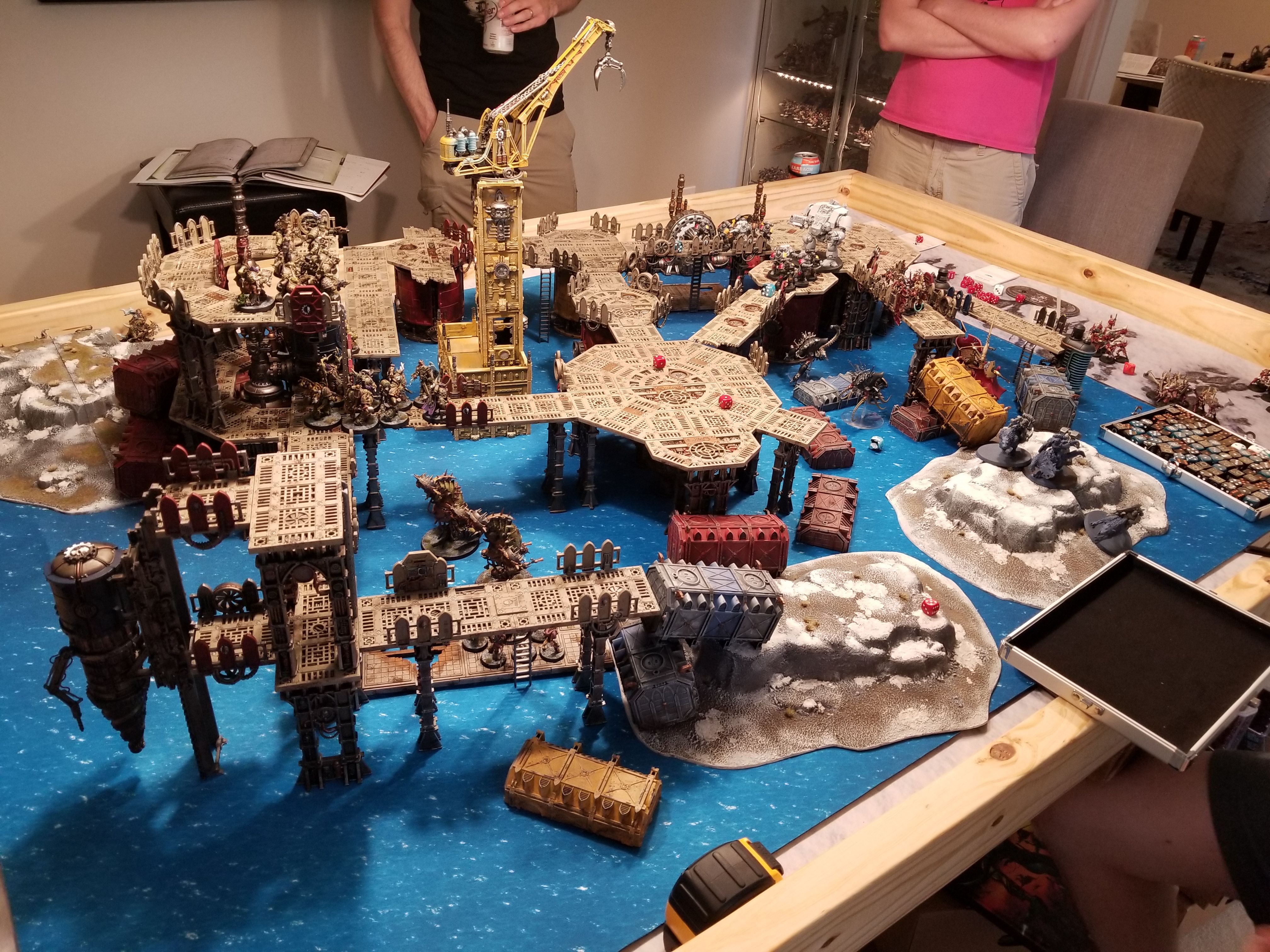 Rolling Road mechanic, i.e. every round or so everything on the table is moved back 12" while new terrain is added to the end to represent the battle being a chase. This is always a fun time and gives the board a dynamic feel while also encouraging players to bring faster units which can keep up and stay on the table.