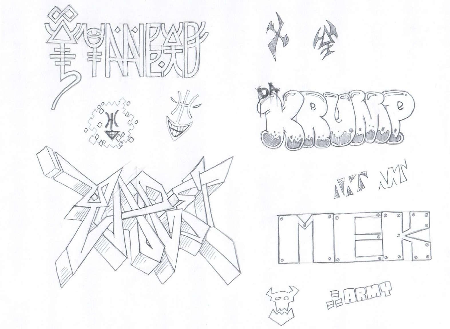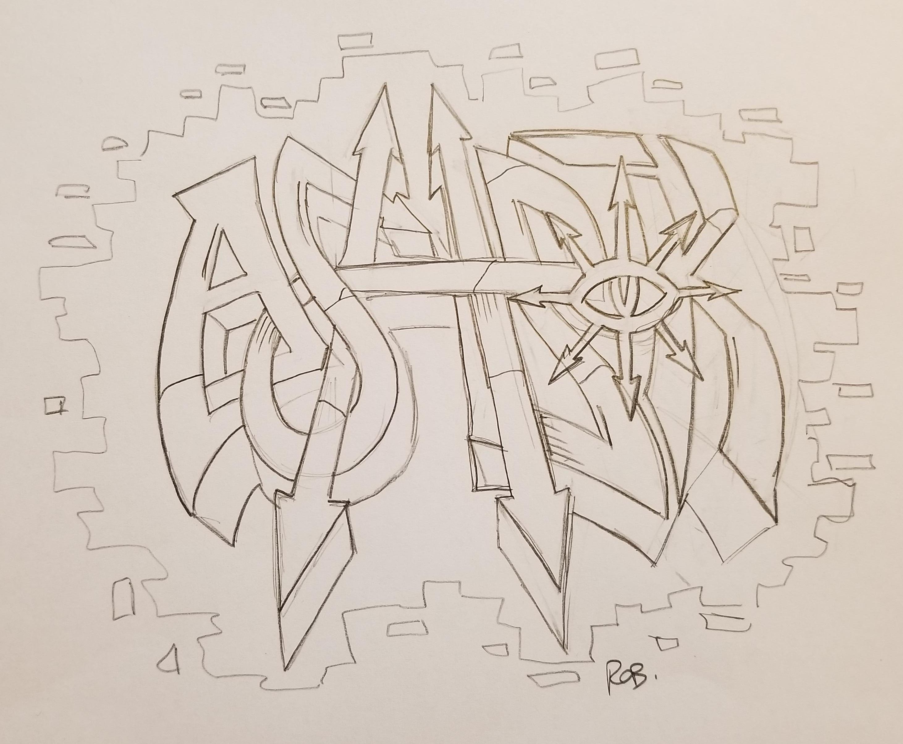 Alright, we’ve gone through the basics of graffiti and some ideas on how to create it for various factions. The first thing you gotta do is sketch up a plan. You won’t have to do this if you’re just doing a tag or throw-up and you know what you wanna do, but for more complex works, you want to have a more detailed plan of what you want. So start by sketching some things out, playing around with shapes and geometry. Do some line work and test things out.