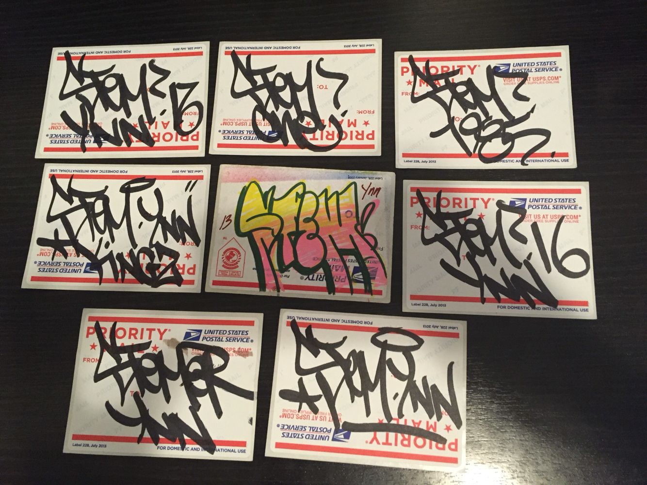 You make some custom stickers or doodle on a sticker surface, then slap it somewhere, like a tiny poster. A lot of these are done on postage stickers, because you can just steal a fistful of these for free from your local post office. If you’ve seen Into the Spider-Verse, Miles does a lot of these on "HELLO my name is _____" name tag stickers, which are also commonly used for slaps.