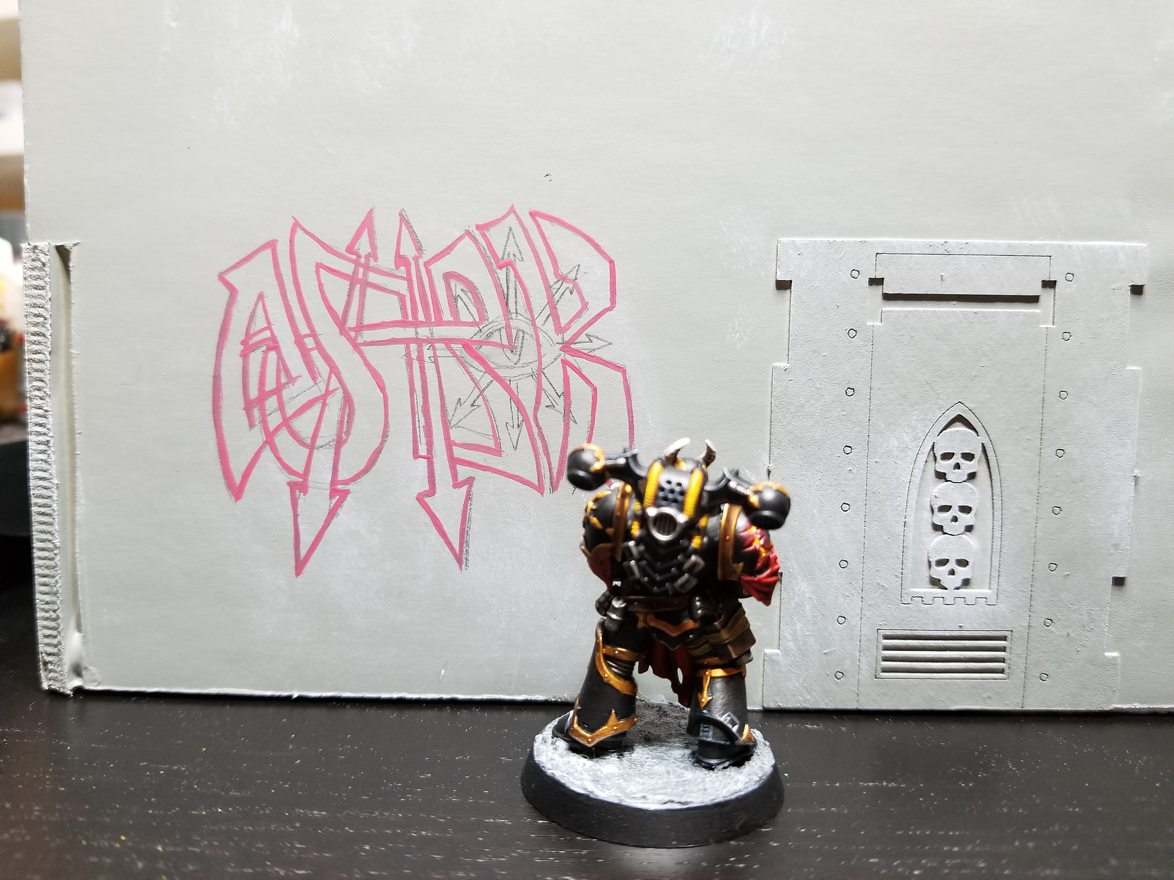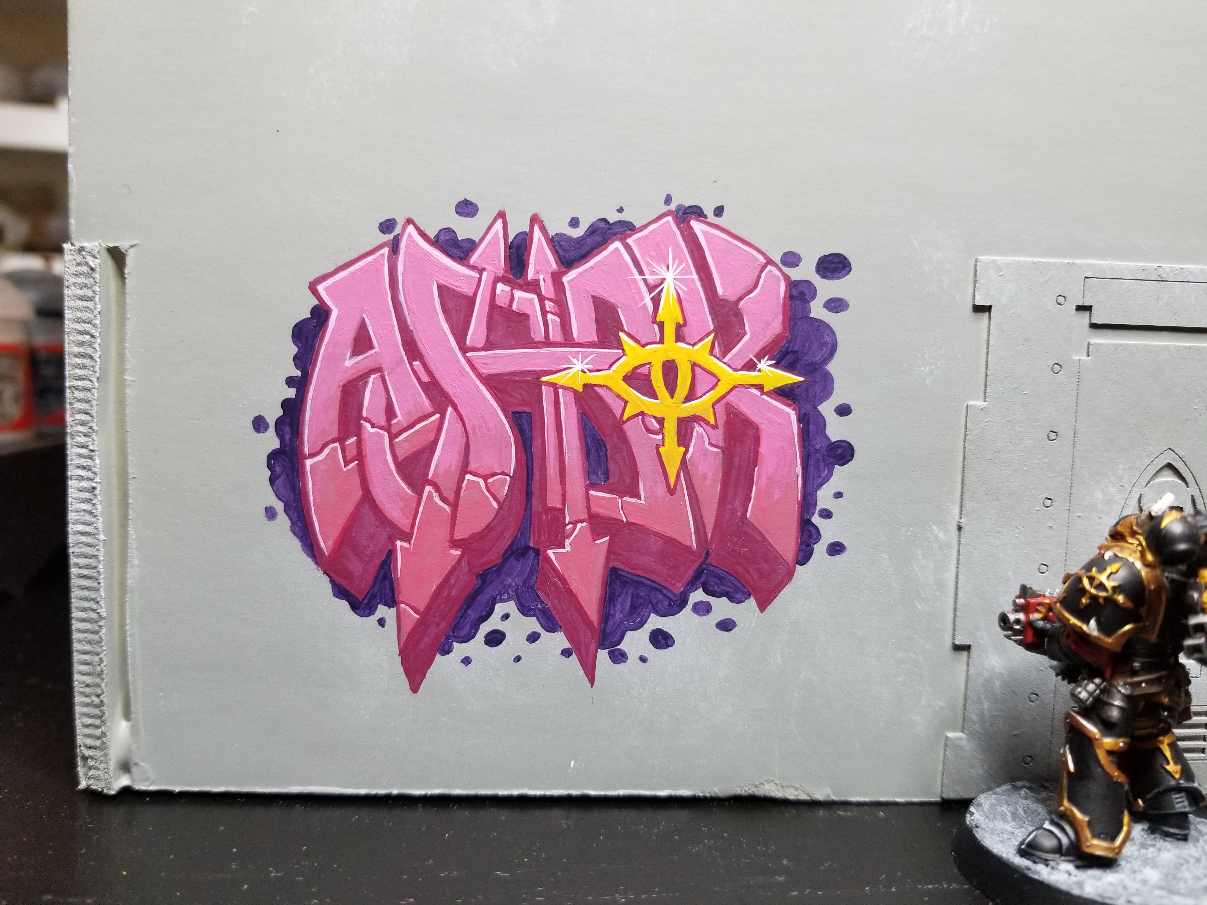 Then, sketch out what you want. Again, this all starts with a story. Who’s doing the tagging, and what are they trying to say? I wanted to do some chaos graffiti, and so I figured out I was going to do a Wildstyle, but I needed a name. Fortunately, Goonhammer created a name generator for Kill Teams some time ago. I fired that up and created a Black Legionnaire -- Ashrok Korda. He’s a former member of the Emperor’s Children and a devotee of Slaanesh, so he’s an appreciator of art and wants to do works that he thinks will please Slaanesh. Also, he uses a lot of pinks and purples -- old habits die hard. Here’s the sketch I came up with based on that. The idea here is to incorporate lots of pointed arrows and use the Eye of Horus as the "O", to show his dedication to the Black Legion and rep Abaddon's forces.