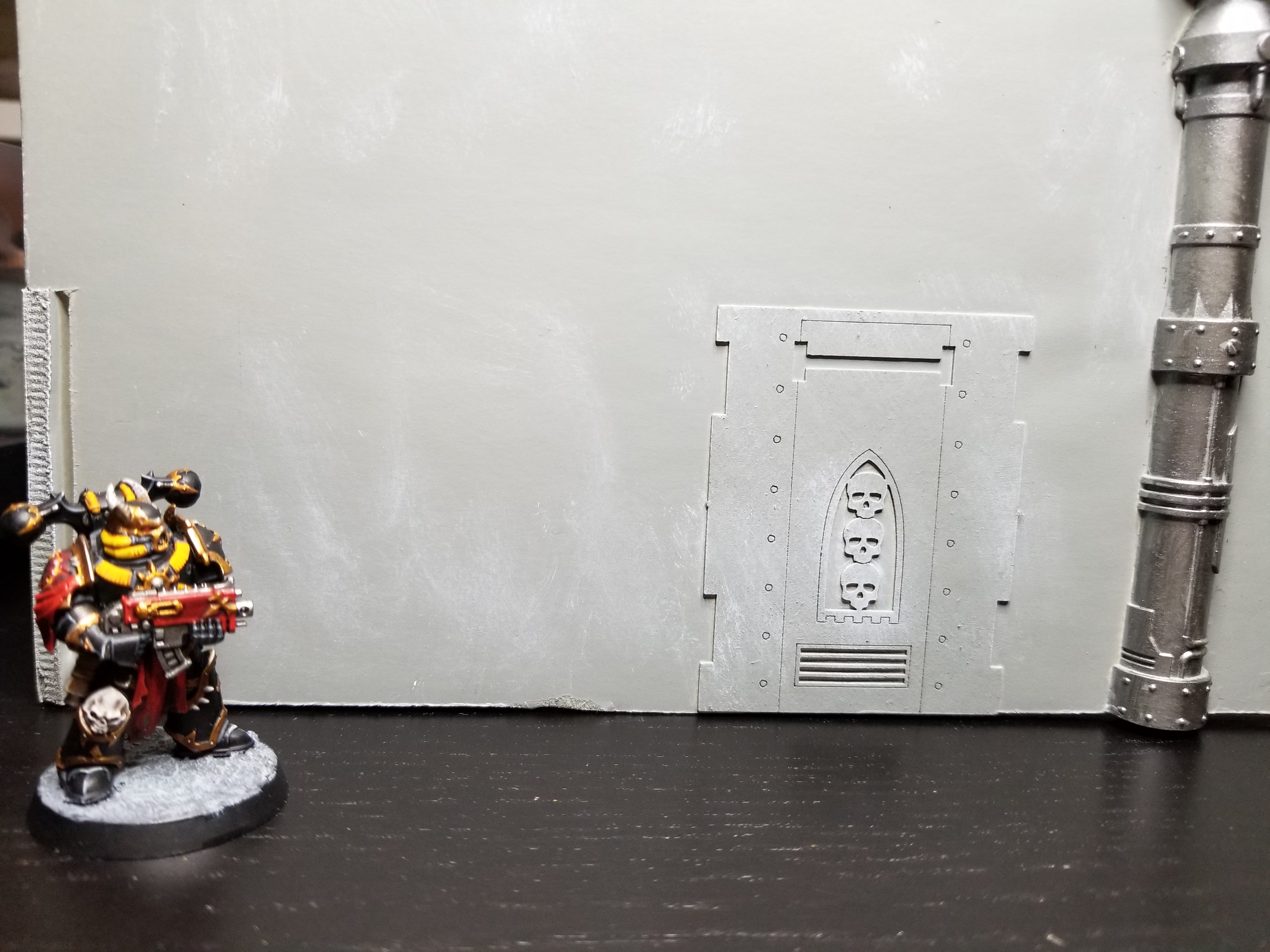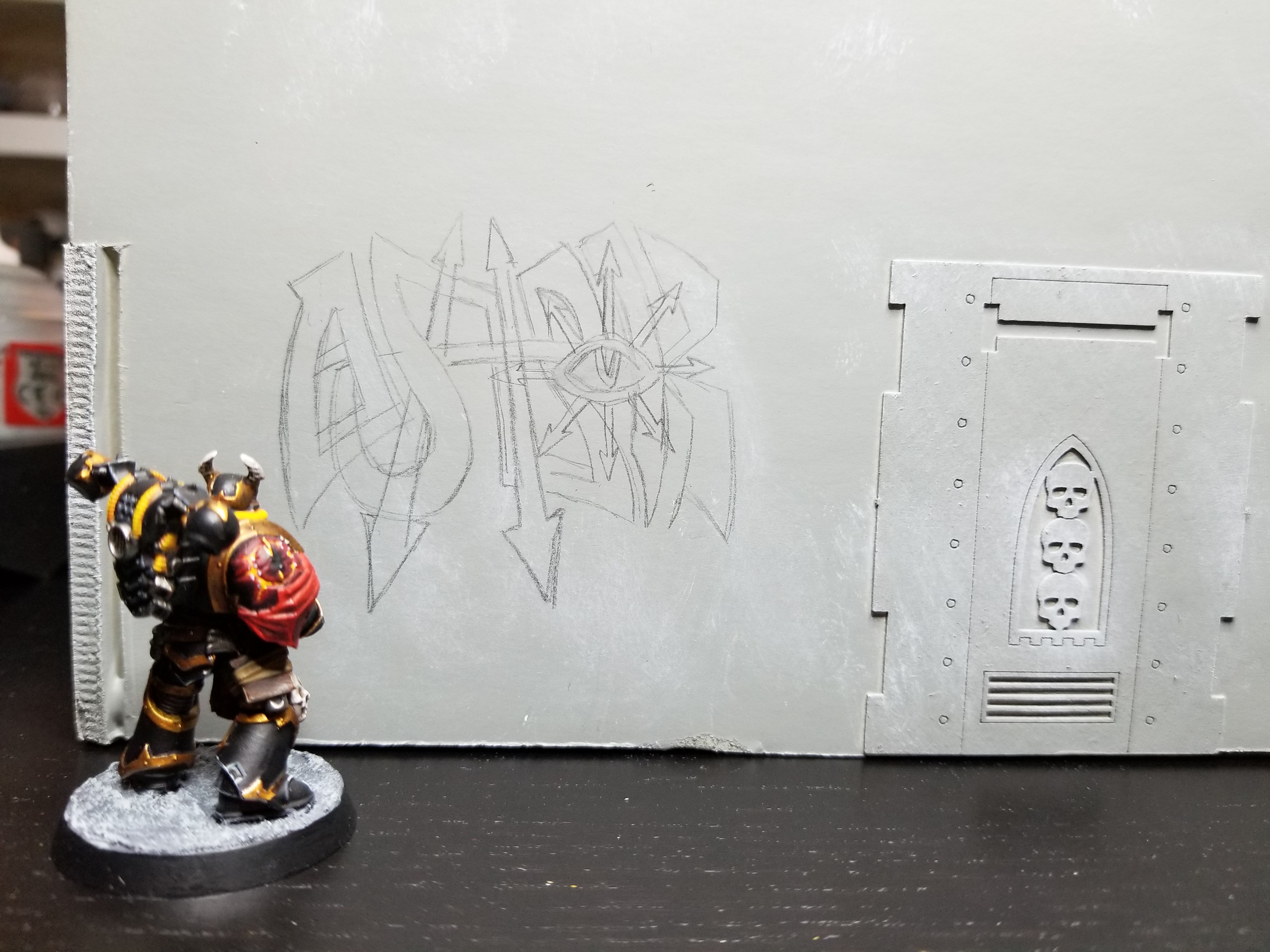 Next you need to find a suitable surface. Ideally this is a big open area of wall that's largely flat, allowing you to lay out your design without having to worry about corners, weird crevasses, or odd geometry. The bigger your design, the more large, flat area you’re going to need. For this piece, I happened to have a large warehouse structure I built a while ago for an Astradus campaign game. That gave me a lot of room to work with. It's not as visible as Ashrok would like, being on the back wall of an old hangar, but it's a good space and he won't have to worry about the local fuzz finding him while he works.