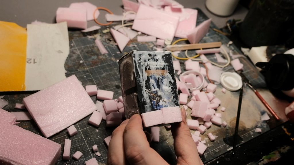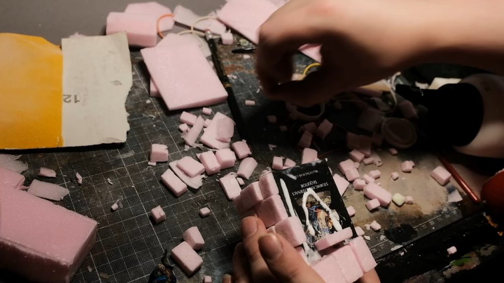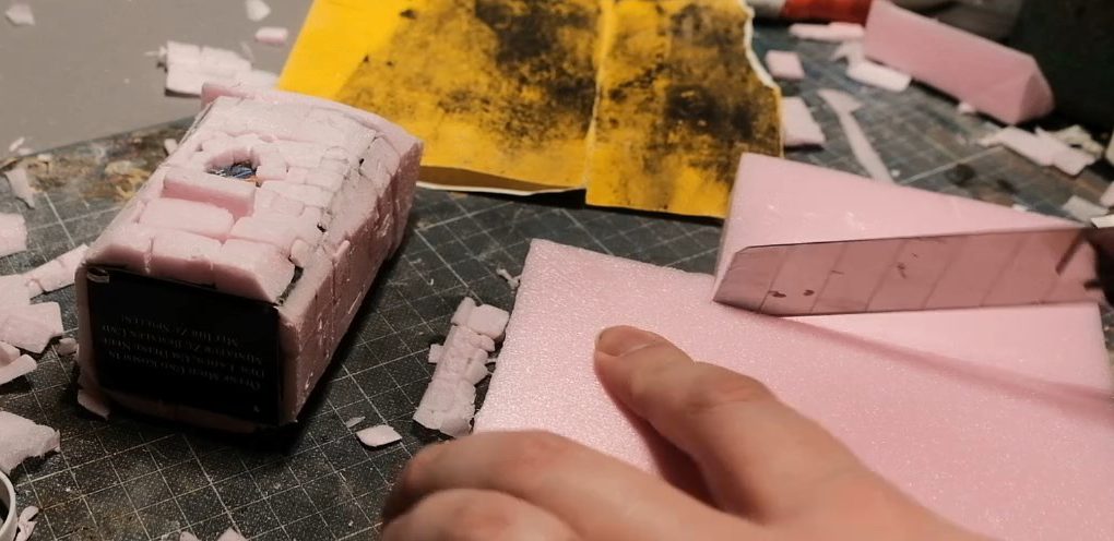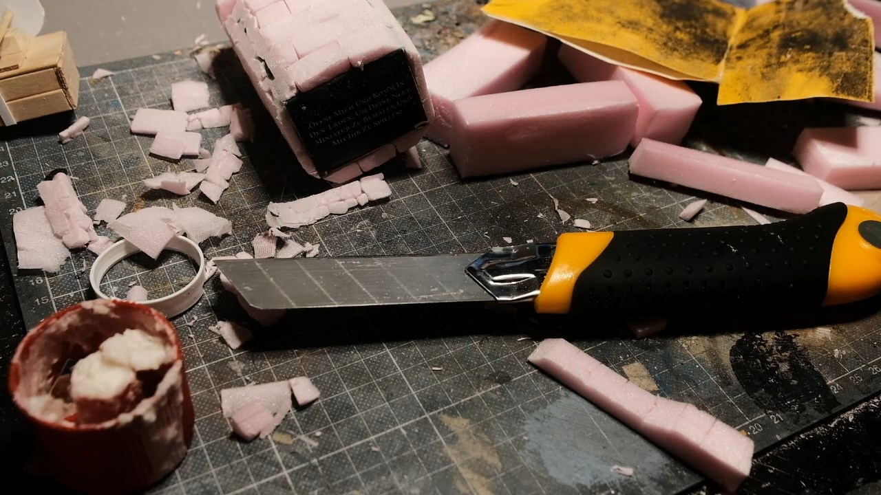 With the building ready to receive them, I then began cutting the pillars themselves out of the XPS foam with my trusty blade, cutting out lengths of equal widths and with lengths equal to the height of the shrine.