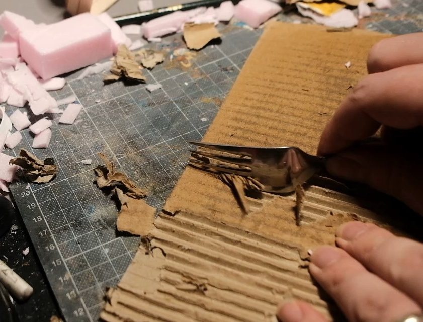 In order to do this, I grabbed a bit of corrugated cardboard with a good bit of heft to it, it needs to be reasonably big so the wave of the tiles is pronounced and legible. I slightly dampened the top layer of the cardboard and then used a fork to peel it away from the waves.