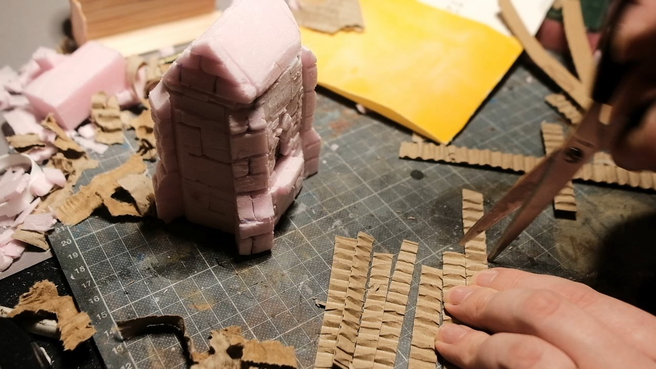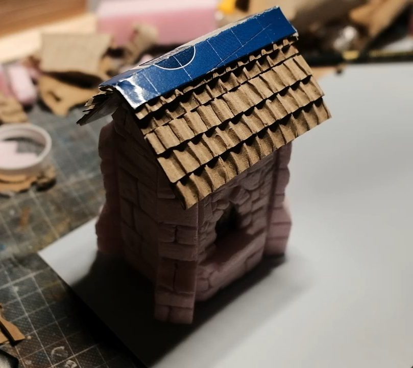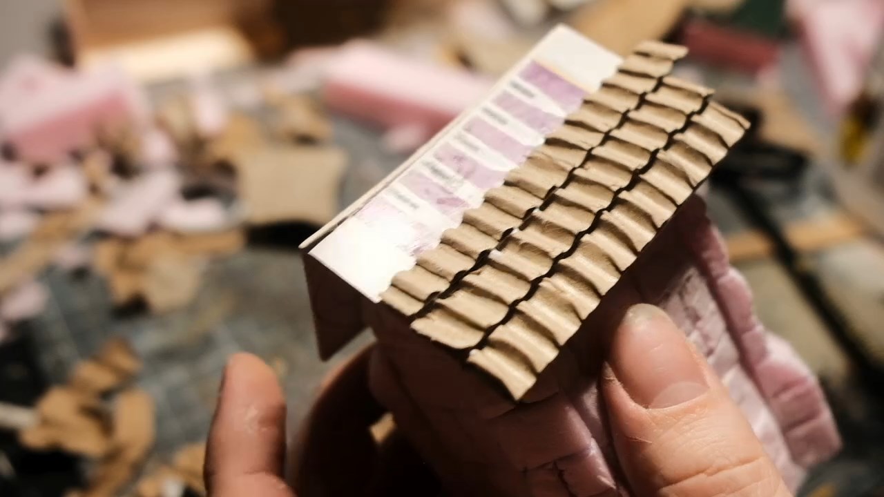 The layers of corrugated cardboard strips build up into a nice looking roof. It's important to use the strip layering method for this though, otherwise your roof will look like a piece of corrugated metal, not exactly the style we're looking for with this one!