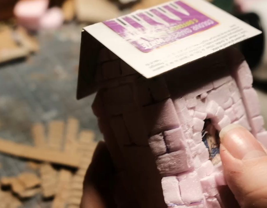 Part way up each pillar I cut in a 45 degree bevel and removed a section to make the pillars a bit more interesting and medieval. Into each pillar I carved the brick pattern with my knife and then pressed it with a pencil to round it out. A bit of stone texture pressed in with a balled up bit of tinfoil and I glued them in place.