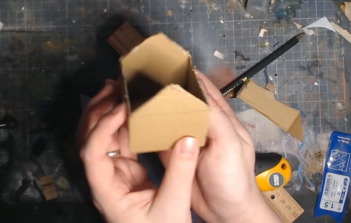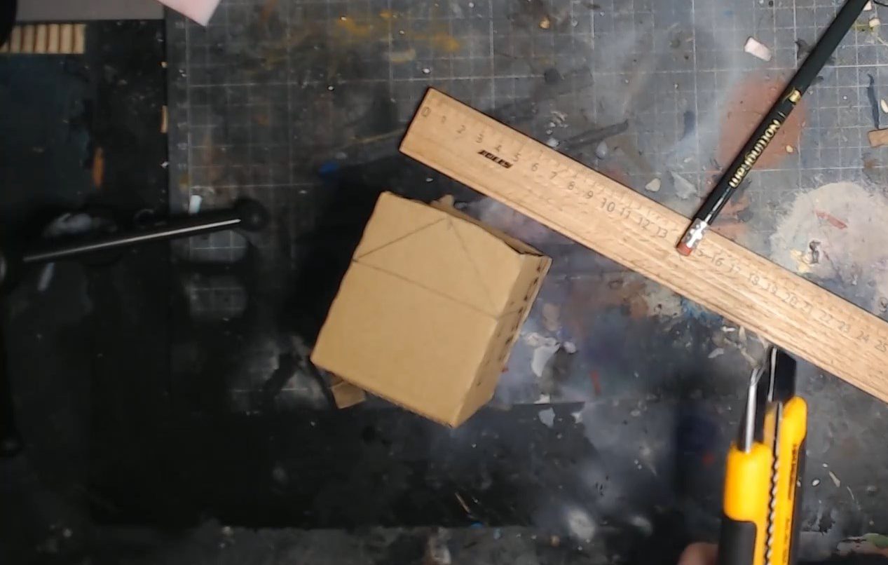 I started by measuring and marking out the skeleton of each building, in this case, a pair of boxes that came with some Ikea furniture. Then I marked out the gables by drawing a band all around each box, and then constructed some triangles by dividing the end part into two, drawing a point in the middle at the top, and then connecting it with the band.