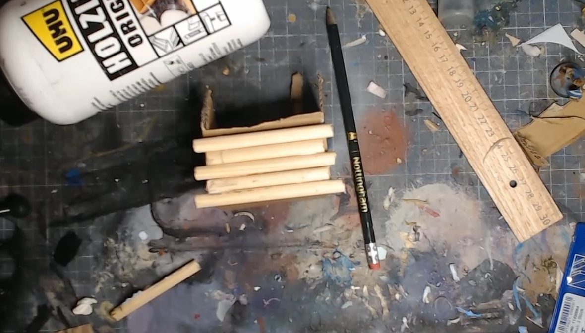 I stacked the logs in place and stuck ‘em onto the box with PVA glue.