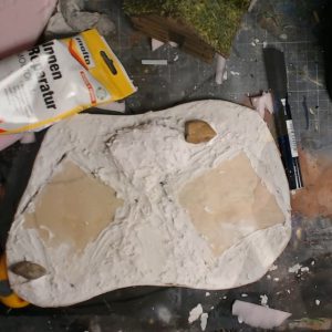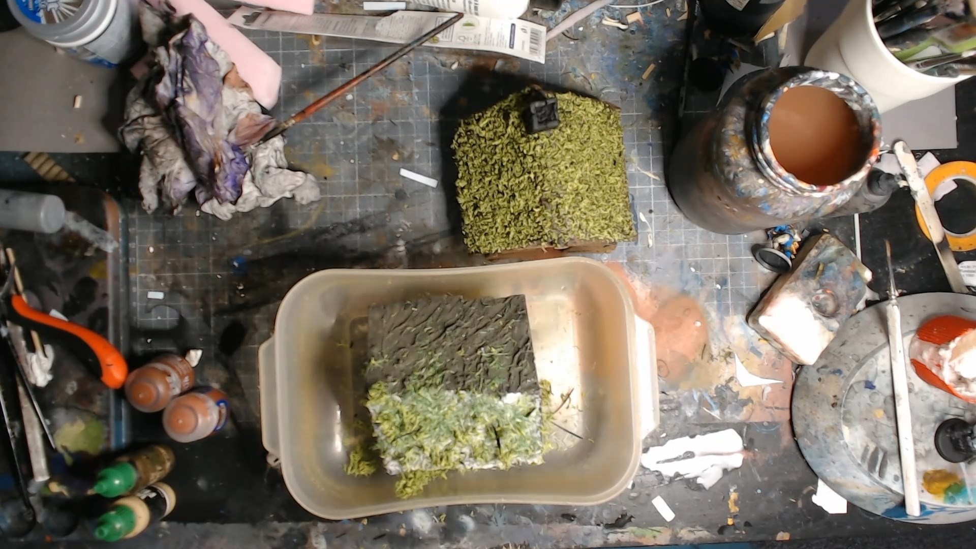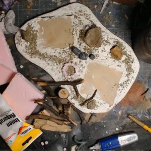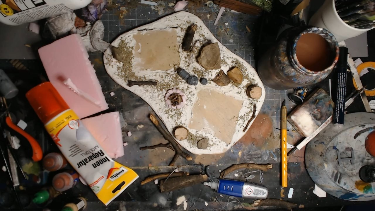 I glued on some rocks made from styrofoam to give the piece a bit of verisimilitudinous vertical variation (say that three times fast!)