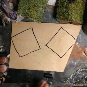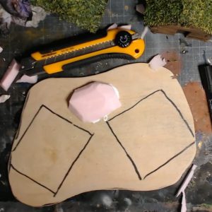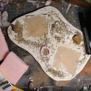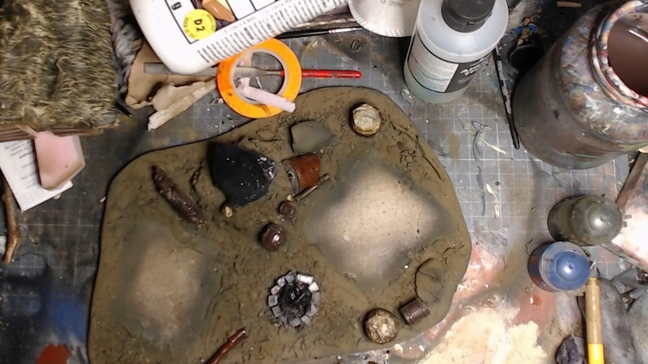 Next, I smeared the whole thing with some wall filler, trying to avoid the footprints of the two cabins, this makes a nice forest-floor mud. Once that was nice and covered, but still fresh, i scattered on some clean cat litter and smushed it into the filler to give it a rougher texture. Next, I took some appropriate-looking bits from my warhammer bits box and cut some foam blocks to go around the campfire. I made a circle with the PVA and stuck the campfire blocks around them, perfect for a rough and ready woodland campfire.