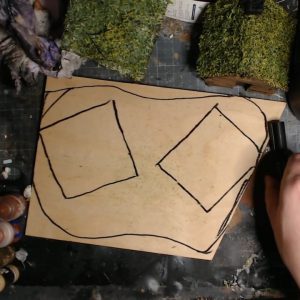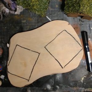I arranged the houses on this piece of wood and drew around them with a marker pen, then drew a vaguely organic shape for the outline, I didn’t want this base to have any straight edges, because nature doesn’t really do them. Once it was drawn, I cut it out with a coping saw.