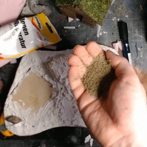 For finer grass, I got a bit of Woodland Scenics’ Green Grass. Blobbed on more pva glue, and sprinkled it over. This stuff is more like very very fine sawdust coloured green, it’s not long grass by any means, but it blends nicely with the mossy undergrowth I’ve already got down.