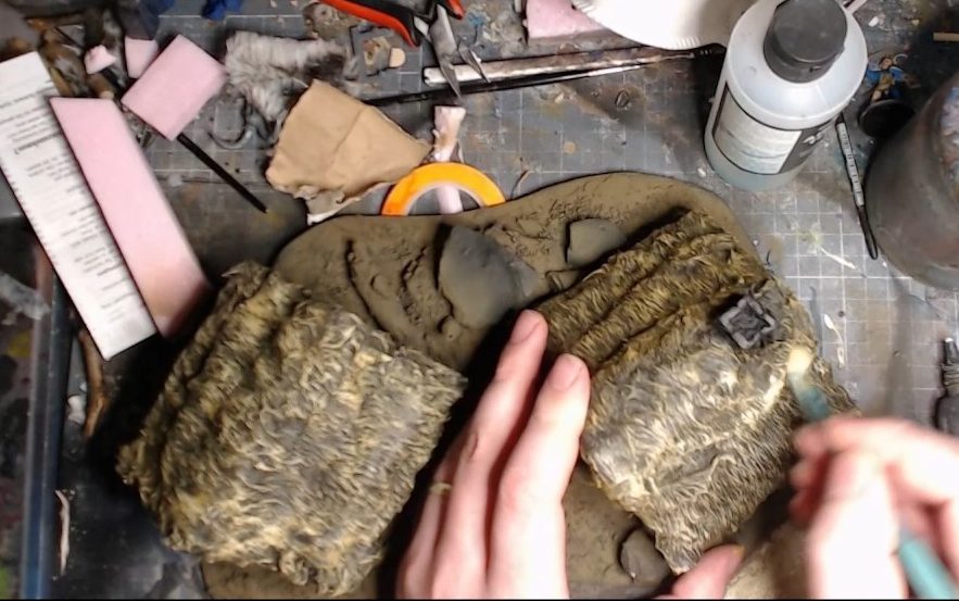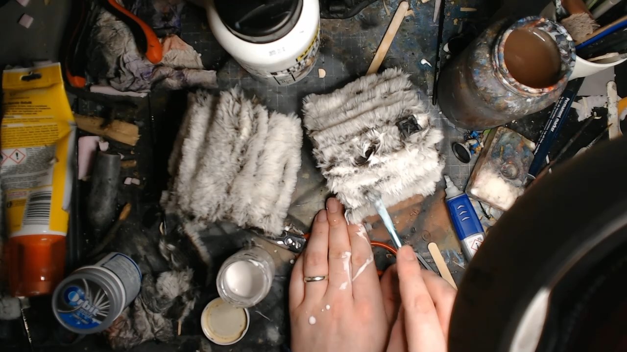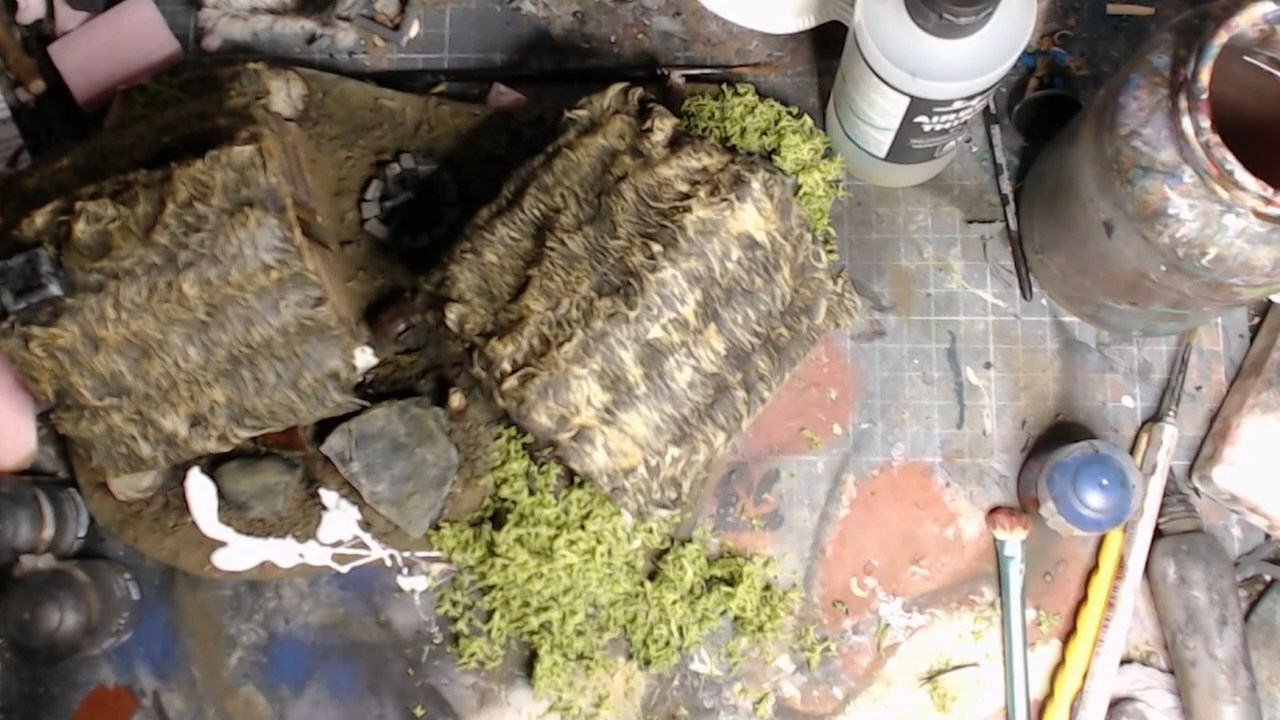 I got a fake fur pillow-case and cut it into rough strips, making sure to cut parallel to the grain, once the strips were cut out, I stuck them to the roofs with some thick PVA glue. With both roofs luxuriously thatched like the chest of a 70s film star, I thinned down some PVA glue with a lot of water, and using a stiff brush I slathered the thin PVA all over the fake-fur, before brushing it out into the grain.