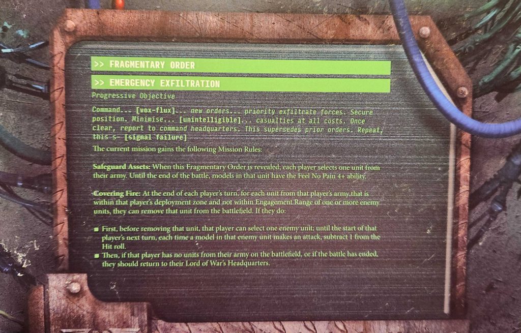 It's worth noting that there was a second "Fragmentary Order" issued mid-game at the event, giving you a rule to remove units from the battlefield via your deployment zone. But this particular rule has no impact on scoring or mission objectives, and I'd strongly recommend just ignoring it.