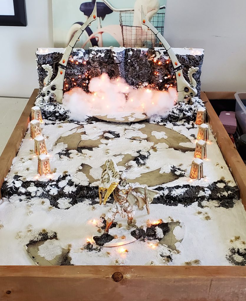 In the end I really liked the look of the cliffs and I didn't want to obscure them - so instead I opted to place the cottony clouds around the base like a fog and let the lighting speak for itself. I also magnetized the arms of the waygates so I can take them off for travel. Some minor work to be done including touching up the magnets to blend into the gate and some areas that need more flocking (I ran out of snow flock) but otherwise I love how it ended up turning out. It took the better part of a month of on and off work but it was a nice break from backlog painting. My favorite part is that the generator can be controlled from my phone and the colors available are essentially anything on the rainbow and a lot effects can be applied to give it a pulsating or breathing look (can even tie it to music!). The goal was to make the army pop and stand out, and I'm happy with where it landed! The biggest takeaway for me was the amount of advance planning and replanning that was required for the fiber optics at each step. Once the foam was in place any rework was going to need a complete gutting and fortunately I did not have to do that.
