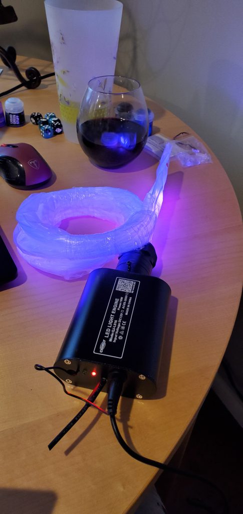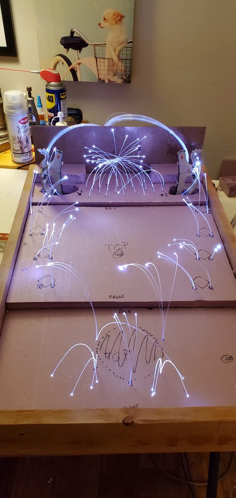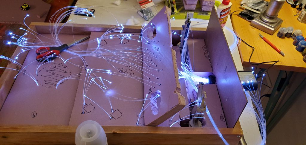 The next thing was designing a concept that maximized the area while also ‘made sense’ in terms of the theme of the board. As I mentioned, a waygate makes a natural tool to divide worlds. Raised platforms also add usable surface area while not adding increased size to the board. I sketched out some concepts of a waygate built into a rock cliff wall where the gate itself opened to a Craftword parade ground. The idea being that I could model in a craftworld interior into the back end of the board and then surround that by cliffs as the waygate breaks to the current world environment. While nice, that seemed overly intensive and fraught with risk. I sketched up another idea where instead of hollowing out the central cliff areas I would use a representation of a webway tunnel including foam and lights. That led me to think about lighting more seriously and what I could really do with it. If the board was going to be durable it would need to avoid requiring bulb replacements or risk knocking around. That meant LEDs, fiber optics, etc. I chose fiber optics because, while a little more intensive and challenging, they don’t require any kind of maintenance – all they need to work is a light source. Further, they can be anchored solidly in place which speaks to the durability component I need from this board. The advanced fiber optic systems are a little pricey, but they offer some nice features (multiple settings, color shifting, phone remote control, etc).