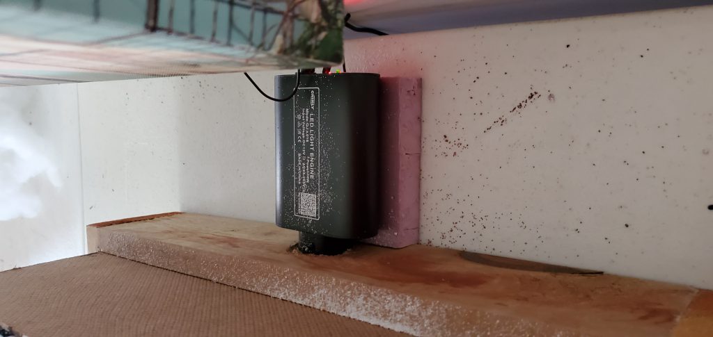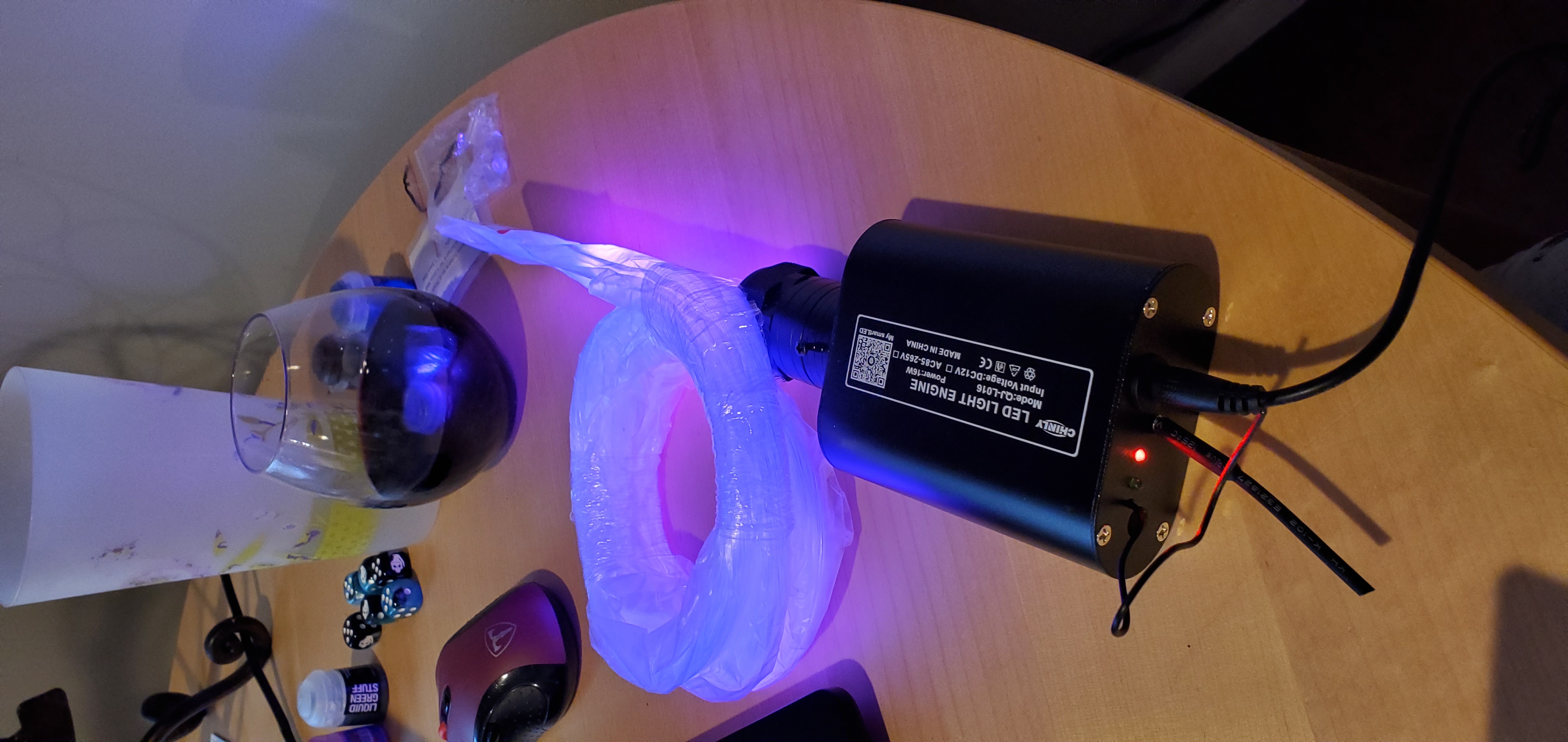 The big decision here was to drill a hole in the frame of the board and place the generator outside rather than mount it internally, either permanently or through some other mechanism. It means that the board requires the generator to be taken with it and set up separately, but it frees up a lot of the space inside for the fibers (which take up a lot of space in the bundle) and also keeps the heat down inside the board. Also, as the fiber bundle is at the end of the board, basically any light source will work here - if I forget the generator or don't have access to a power outlet/extension cord then I can simply place a flashlight against it to achieve the same effect.