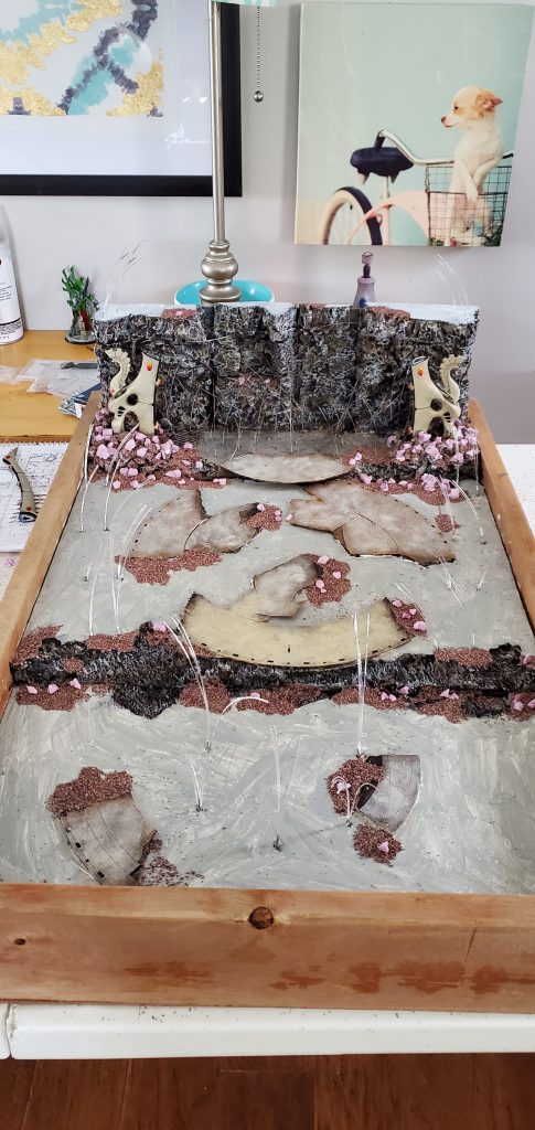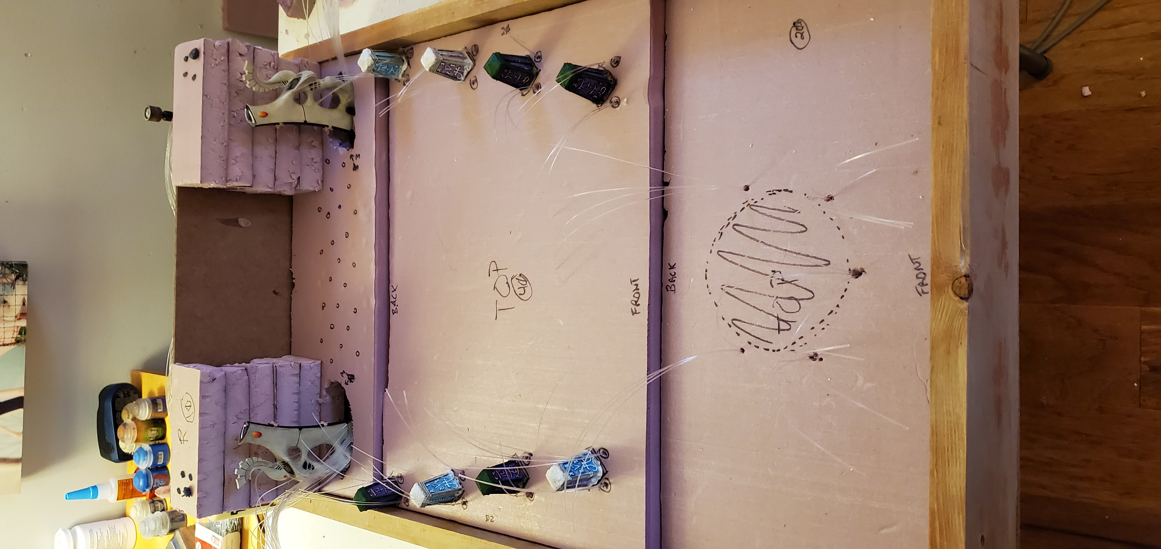 With some sketches in hand and a vision in mind, I began to think about how the fiber optics would be housed. I quickly realized that I wanted the light to be available throughout the display not just at the waygate itself which means running strands through the length of the board. Going back to the sketch pad I laid out how I thought the strands should be divided up and why/where. With Lord of the Rings or the picture of the Avatar and the Court of the Young King on my mind, I figured statues could line the ‘ramp’ to the waygate or be installed in the cliff face itself. Looking at my options I found some old obelisks that I purchased as a ‘what if’ like a decade ago that fit the bill for decoration to ‘line the path’ and a few resin statues that could stand in for aelf warriors of legend. With some general layouts in mind I began to cut the foam base and draw out and lay the fiber accordingly.