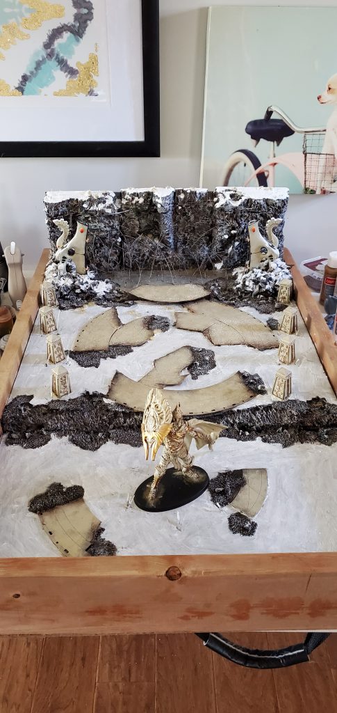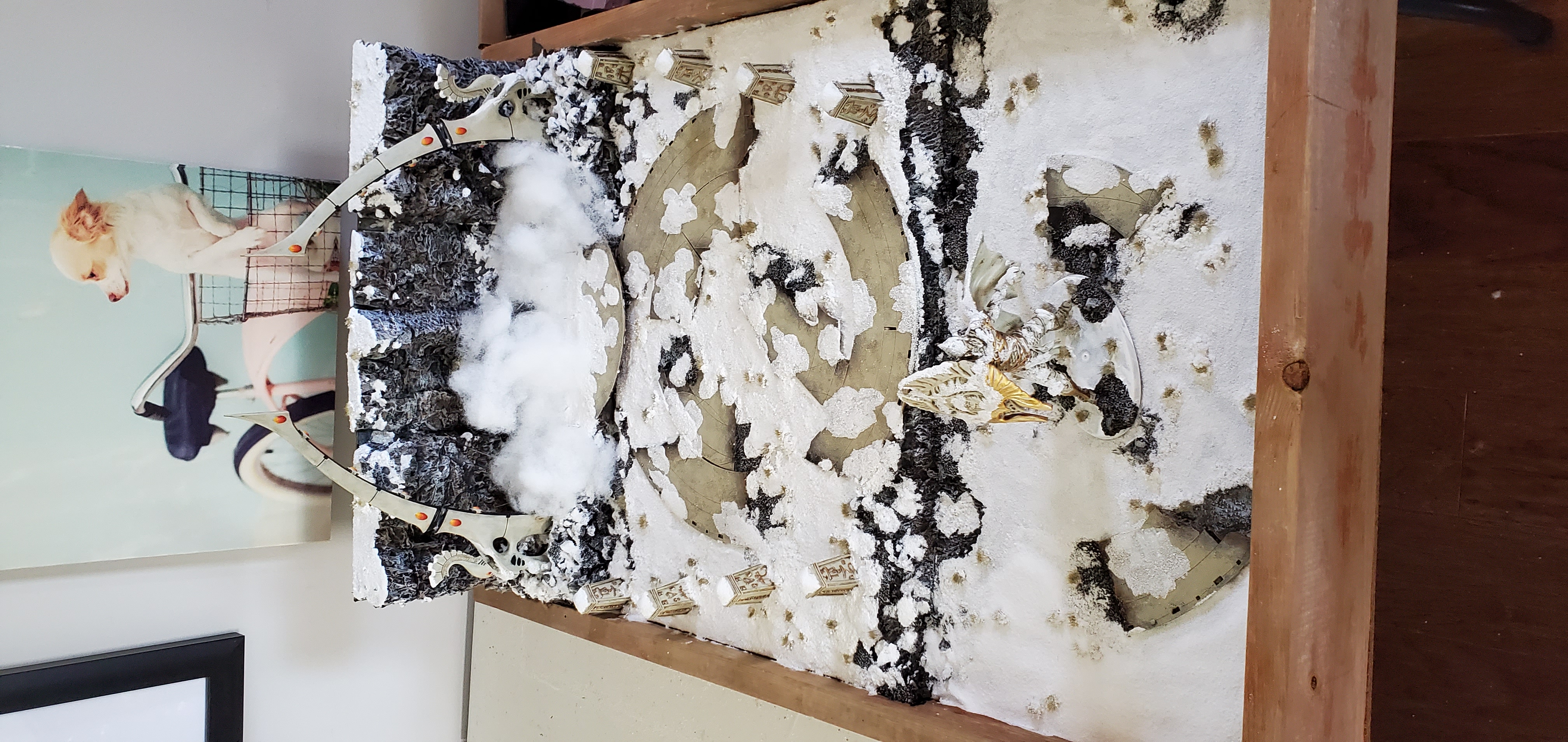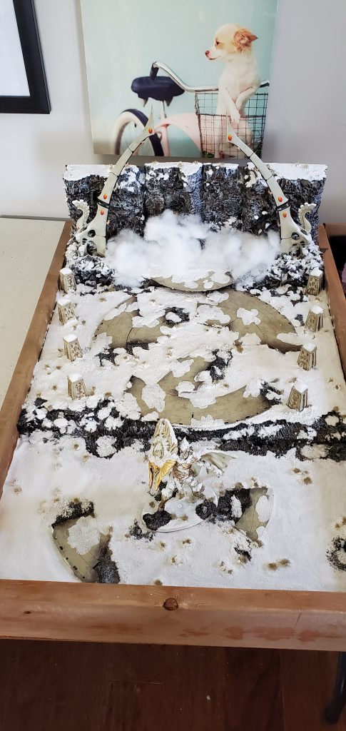 hobbying at competitive events roundtable, a display board is an infuriatingly necessary component to a paint judging competition – and the unfortunate reality is that the more impressive the board the more positive the overall impact to your army due to first impressions. So with that in mind I set about to create a board that was both technically and visually stunning as well as keeping with my army’s general theme of snowy/wintry conditions (as befitting a member of the Frozen North). This created several challenges because Eldar and snow really limits your options or forces absurd amounts of creativity around “how did that Craftworld get so snowy?” Fortunately, GW made some fantastic Eldar terrain pieces that you will never convince me were meant to have an in-game purpose: Waygates.
