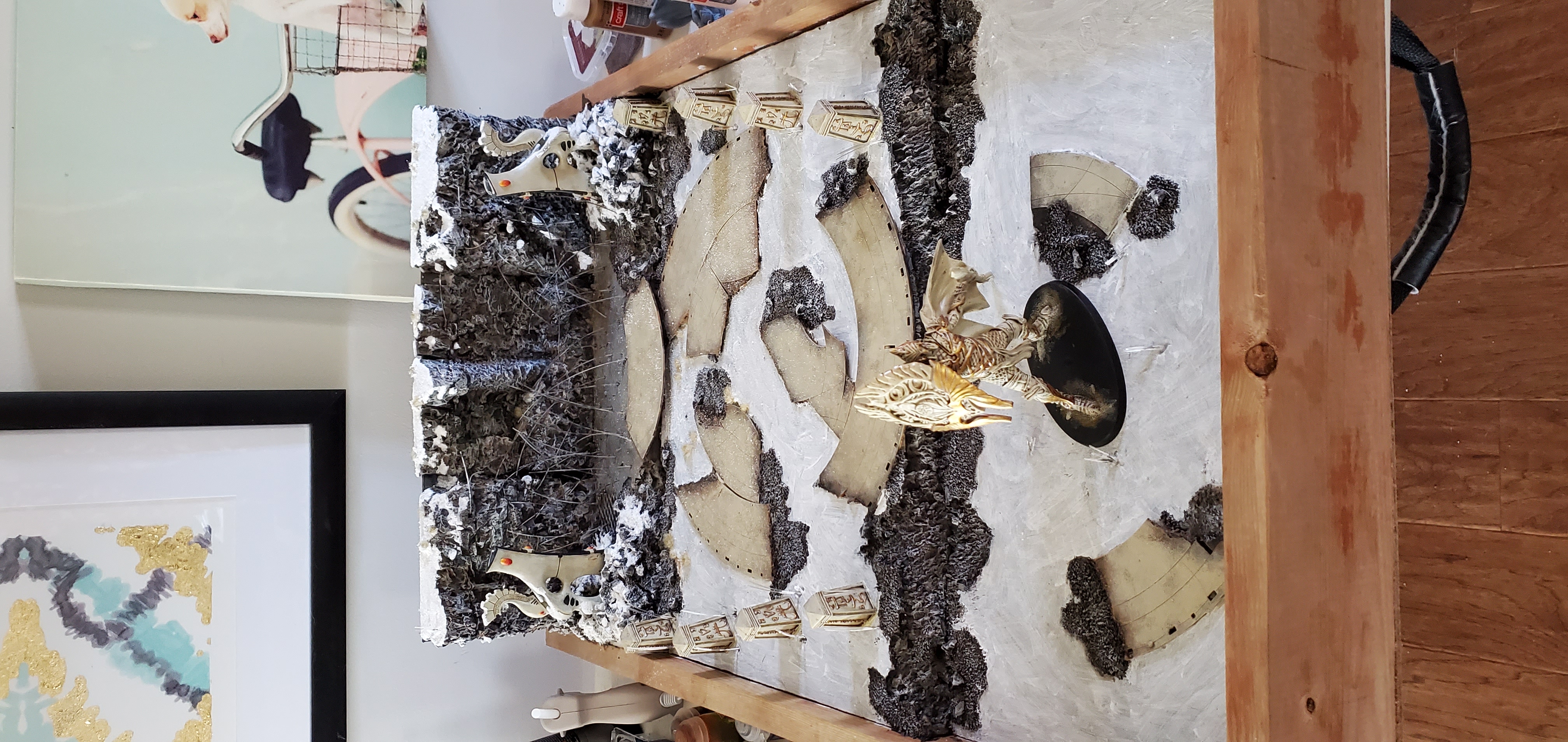 With the fiber optics all placed I felt like I was 50% there. I was also extremely nervous because at this point a lot had been invested into the board in terms of time and material. The waygates were more or less permanently mounted and I was concerned that messing up the fiber by cutting poorly or messing up the facade would ruin the whole thing. Trying to envision how I was going to handle the 'portal' it wasn't clear to me and I quickly realized that I did not leave myself enough room to really carve out a view of a Craftworld or anything else (refer back to my first piece of advice about making sure you have enough surface area). So instead I figured I'd fill in the blank area with additional cliff face and then use cottony clouds backlit by fiber optics to visualize a swirling portal of the webway tunnel.