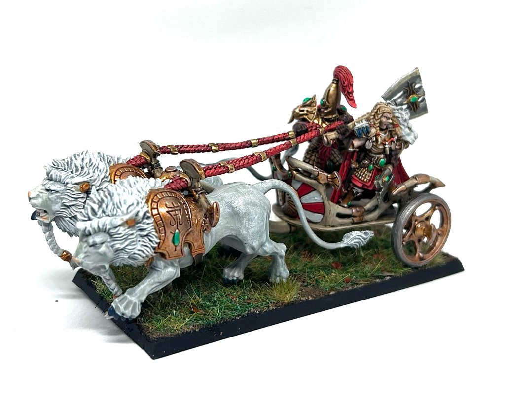 Falcon: The Chieftain's Chariot is the first of several questionable choices in extra unit options in the book for me. It is just a marginally-cheaper Lion Chariot with one less rider and one less wound. In every other way it is exactly the same as the regular Lion Chariots which feels like a real let down that's taking space from something cooler. I understand this is probably a modelling thing so people don't have to consider how to fit a third rider on their current kits, but if feels lazy. That said, as Liam mentioned, Korhill kinda slaps on one, and there is definitely a fun build around him and two other chieftains going full Fast and the Furious around the board if you're into that kind of thing.