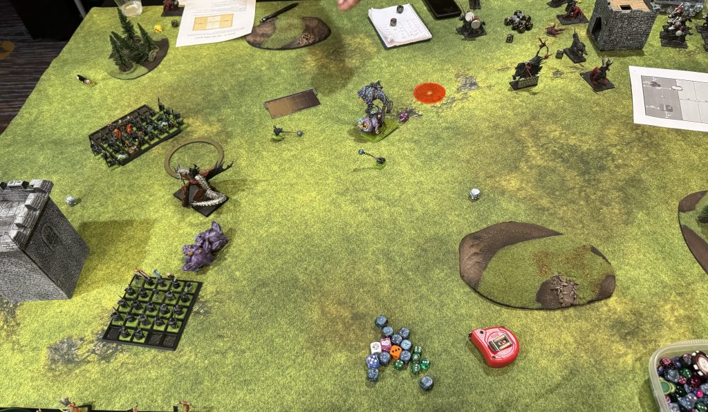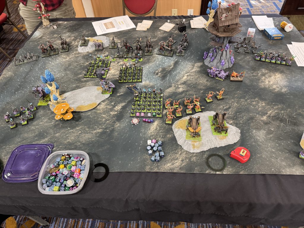 This was the match I wanted to play all event. Luckily I got to play it for round 5 and end day 2 on a high note. His army was a LVL4 Waagh wizard on Arachnarock, two units of 40 night goblin archers (one with spider banner), six fanatics, a bone grinder, two doom divers, wolf riders, and two mangler squigs.