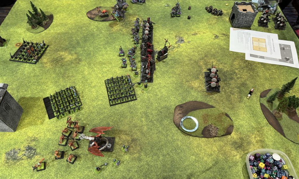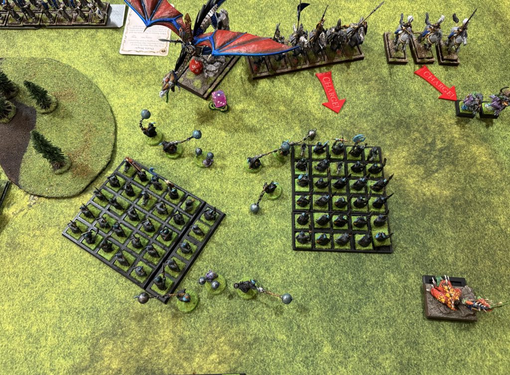 I don’t out threat him reliably, but I sure do shoot better! He wins turn one and moves forward very aggressively. Creating a very fanatic friendly battle line. I respond kindly…marching two units up and casting arcane urgency to reform one unit out of marching column. The rest of my army stays out of dragon charge range and my hoppers on the right gum up his cav to force a bad charge that I can counter with the remaining hoppers. Importantly, I get itchy nuisance off on the dragon to drop it to T5 and do 2 wounds with shooting/magic.