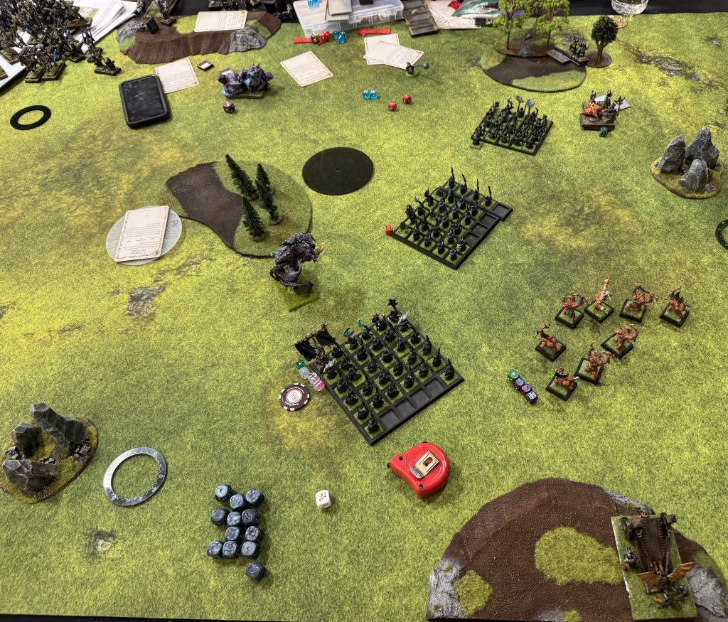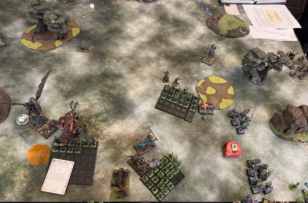 I get paired down into a Beastmen player running a MSU build. His list highlights were a Viletide + Elementalism + Hagtree fetish lvl4 shaman on chariot, a beast lord on chariot, a Shaggoth, dragon ogres, and chaos spawn (the little bro version) with the mark of Khorne.