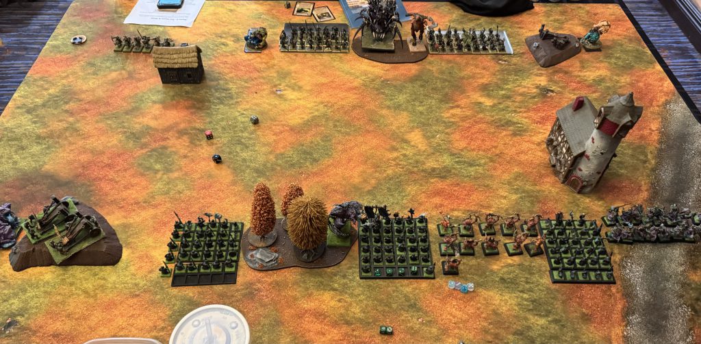 My opponent round two is a local from a community I’ve been playing with since pre-COVID. I had just beaten up his Bretonnians at a previous RT so he was out for vengeance. His list featured a large block of sword masters, a lvl4 illusion wizard, a prince on dragon with the dreaded 3+, 5++, 5+++ statline and some other cav and shooting units.