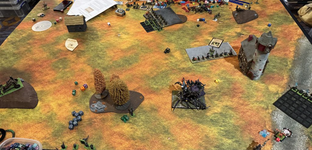My opponent goes first and both his doom divers misfire and can’t shoot for two turns so off to a great start. He casts foot and shimmies up. My turn I sent my squigs up aggressively to pressure his doom divers and force him to come forward a bit. I take a couple wounds off the Bone grinder with shooting and magic, and kill a few goblins from the right unit with a fireball. His turn 2 he charges my mangler with his bone grinder and they kill each other. Our flanking forces clash and I come out on top in my turn two killing the wolf riders and his mangler squig. Turn 3 we both release fanatics and our fanatics touch…with some killing each other and my two whiffing and not killing his mangler squig! He wipes my right flank with fanatics and shooting. I am able to kill the mangler in combat somehow with goblins on the left and then my Big boss on cave squig and my remaining goblins charge his left unit of archers. He begins to obliterate my big unit of goblins and characters with shooting and magic. The game wraps up with his Arachnarok wiping my orc archers and my night goblins in the center thanks to a failed terror test. I fail to wipe out his remaining goblins on the right but kill the unit on the left and one of my wandering fanatics kills his last doom diver somehow.