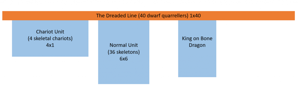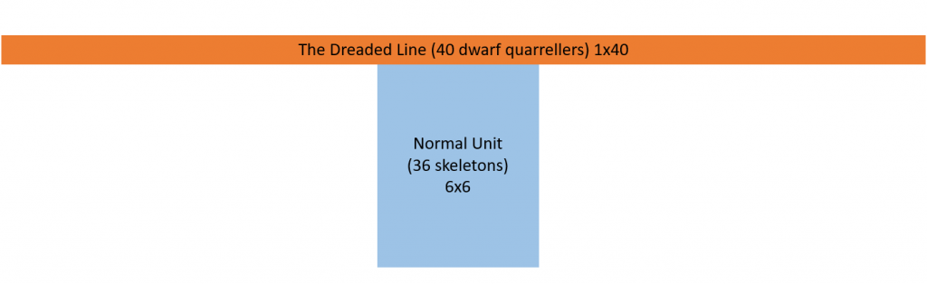 That's more like it! Yes of course The Line costs many less points than everything else I've got there but the main point of The Line is to get in the way. How you deal with this is charging it with as many units as you can commit at once; do not feed it one unit at a time! Between impact hits and attacks those dwarf quarrellers are now in a lot of trouble losing and likely losing that combat.