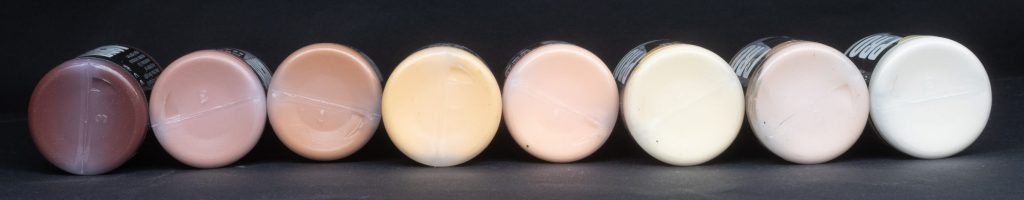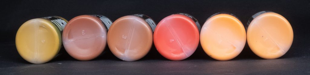 Olive Flesh - The lightest of the explicitly skin toned paints, Olive Flesh is somewhat sandy with a slight touch of green undertone, it works pretty well as a mixer to highlight any of the other skin tones, or straight to highlight skin with a more Eurasian appearance.