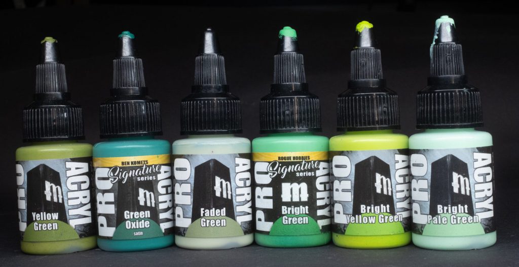 Yellow Green - As the name suggests, this yellowy warm green could also be called chartreuse; it’s very punchy, fresh, and rich. Similar to Citadel’s Elysian Green I love this one as an ork-skin midtone.