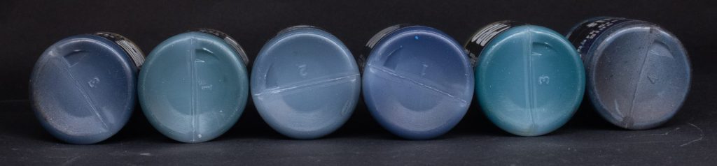 Note: All of these paints need a lot of really hard shaking to mix the glitter/mica flakes into the paint properly, if you don’t you’ll probably find that they’ve separated in the bottle, be warned!
