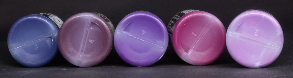 Purple - One of those paints (alongside Blue and Green) with simple incredibly non-specific nomenclature; it doesn’t tell you what kind of purple it is, only that it’s purple. Ah well, this paint is a kind of boosted lavender colour, and as with all the paints in this family it’s very vibrant and saturated.