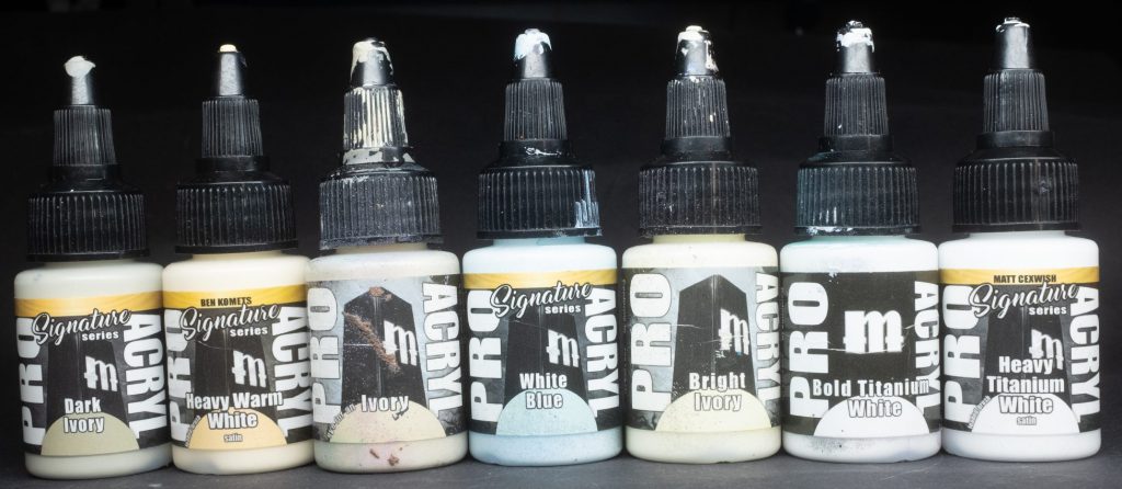 Heavy Warm White - Part of the Ben Komets signature series, and one of two heavy body paints in the current ProAcryl roster, HWW is a thicker, goopier consistency than the rest of the ProAcryl line. Some small subtext saying “Loaded Brush” next to the paint name lets you know the apparently intended use case for this paint, though I’ve found it pretty good both for mixing and for just doing very precise white highlights on all kinds of things.