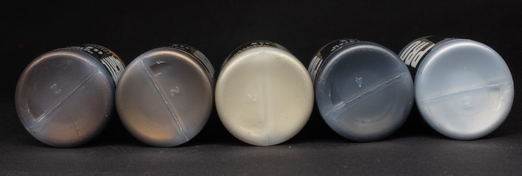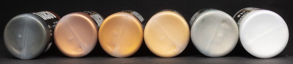 Silver - Yep. It’s silver alright, no denying that. Very useful to edge highlight all sorts of metallic paints and as a mixer to brighten any of the other metallic paints.