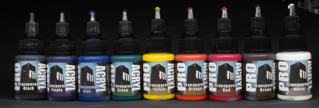 Although these paints aren’t explicitly labeled as “inks”, they behave similarly to other ink products, both as a hue shifter and a saturation booster, plus when diluted with water or wash medium they work really well as shades as well. All of the transparents behave the same way, with the only real difference between them being their hue. Mix Trans Brown and Trans Black for a really punchy Agrax-but-more-saturated shade. Go over leather or wood with Trans Brown to really punch the saturation and unify your highlights. Trans Yellow is great for a sort of candle-light OSL. These things have a ton of versatility and certainly have a place in your toolbox.