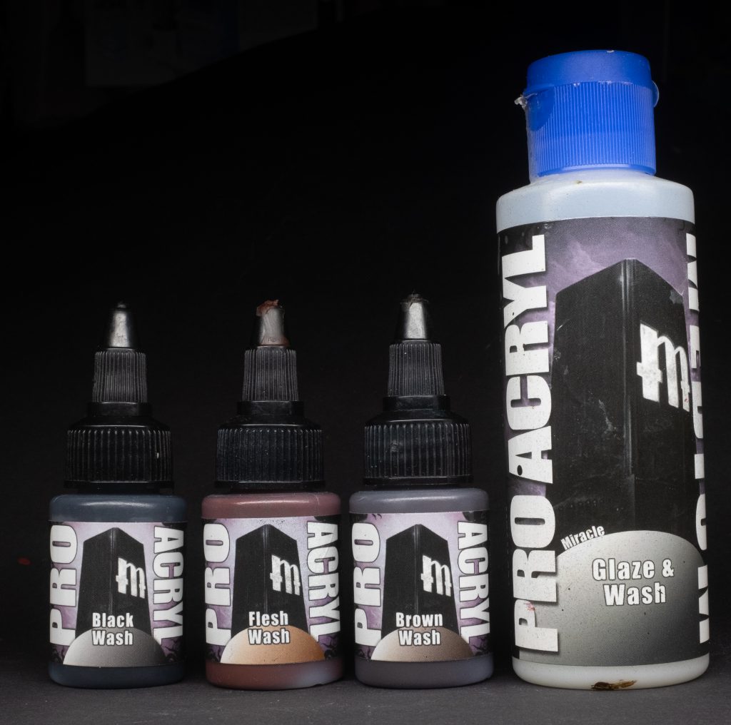 - Very limited selection of washes (only 3, black, brown, and flesh), however with the Glaze + Wash medium you can turn any of the PA paints into pretty decent washes, so it’s not any kind of fatal flaw in the system.
