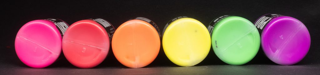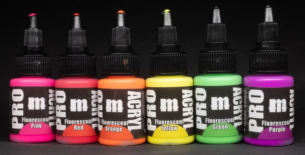 NB: All fluorescent paints cover like absolute arse, so please mentally add “covers like arse” to the end of each of these descriptions. You’ll notice that there is no Blue in this category, according to the source this is because it’s very difficult to make a good fluorescent blue paint.