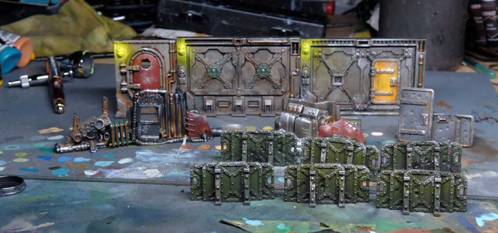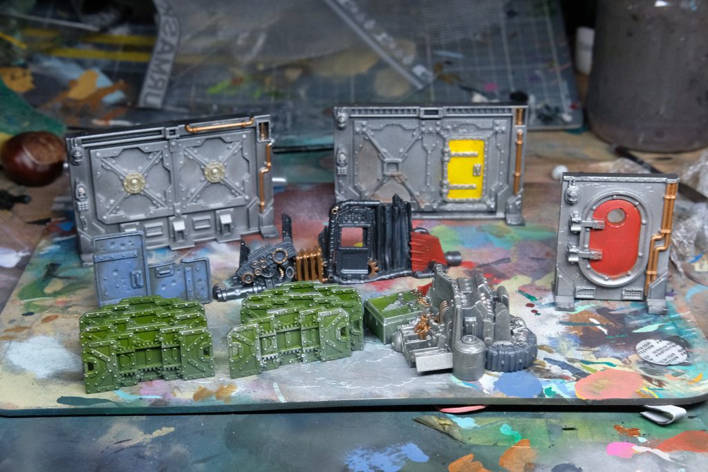 So to test this new miracle product and see if it’s really as they describe it, I primed and put some basic colours on a bunch of small scenery bits I had lying around, including some bulkheads and barricades from Necromunda, the portable barricades from Kill Team, and some of the Ork Mek-style scenery.